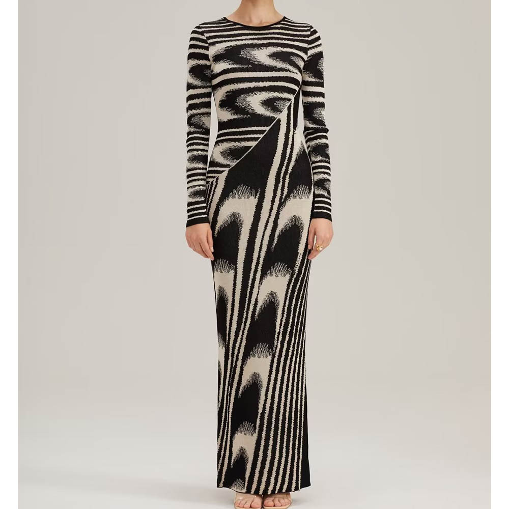 欧米2023秋冬新作三色シック抽象ジャカードニットロングスカートスリムワンピースT10-A266
