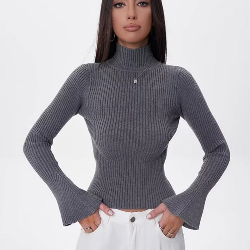 クロスボーダー2023冬の新型アメリカ式高襟弾力修身ラッパ袖ニット女性の中に長袖プルオーバー