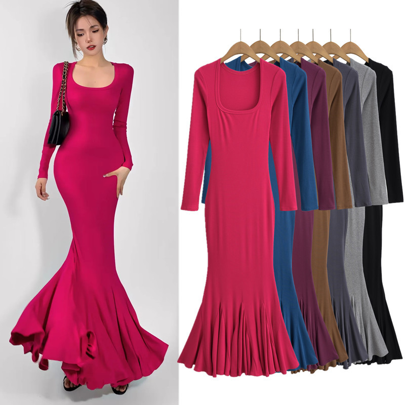 ギャル一歩生蓮気質魚尾ロングスカート女2023秋弾力修身底長袖U襟ワンピース