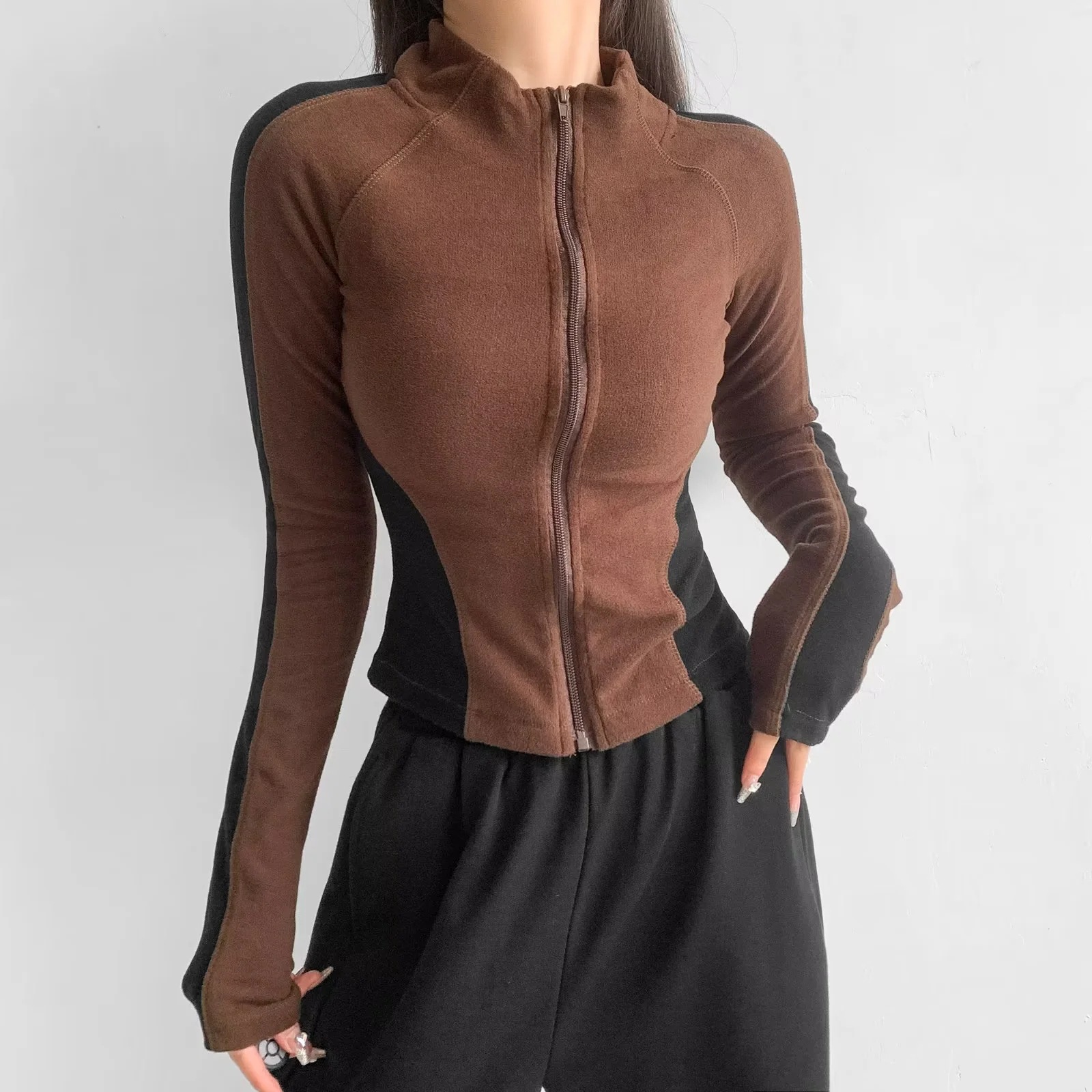 ギャルのレトロな色合わせの肩袖と帽子のカーディガンのダブルファスナーのカーディガンの女性2023項の色合わせの長袖の上着のコート