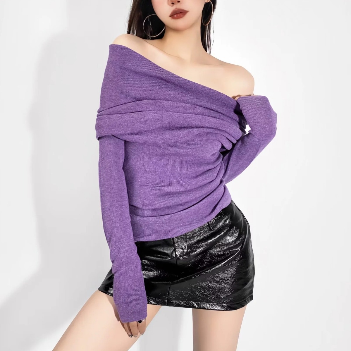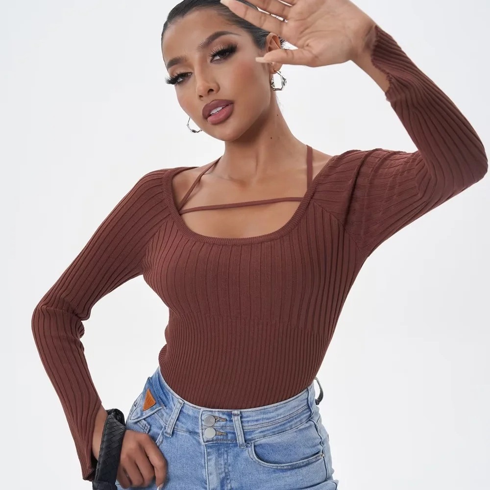 クロスボーダーのセクシーな修身の大きい丸首のストラップの首の穴のニットの女性の秋のオープンフォークの長袖の修身のニットの上着