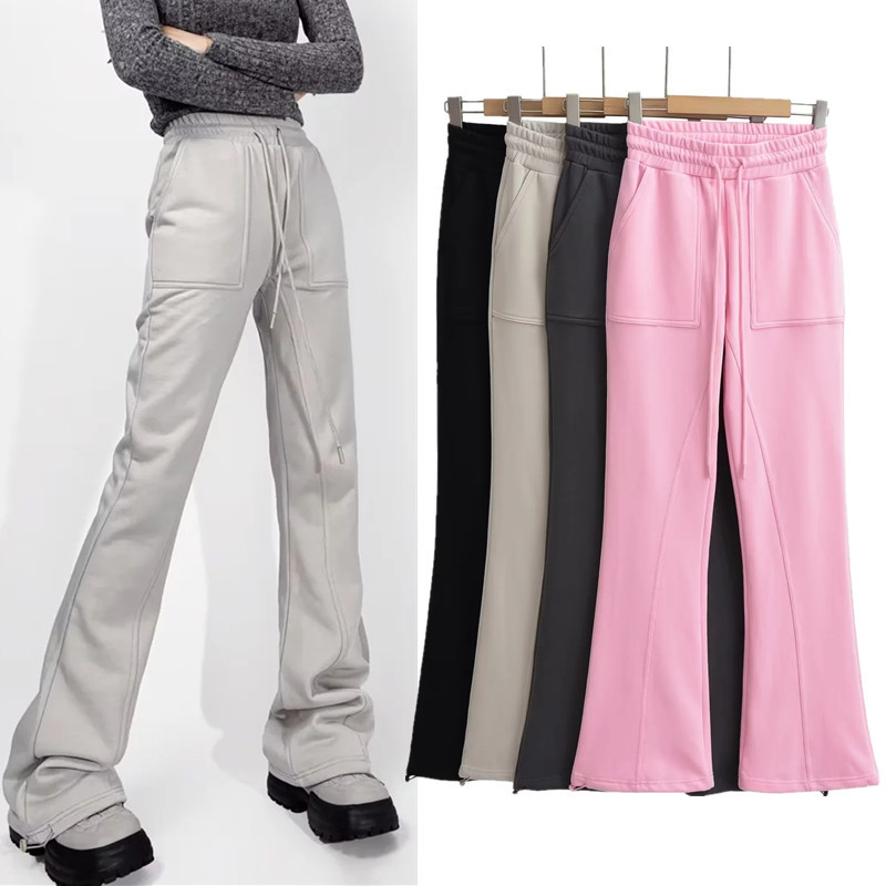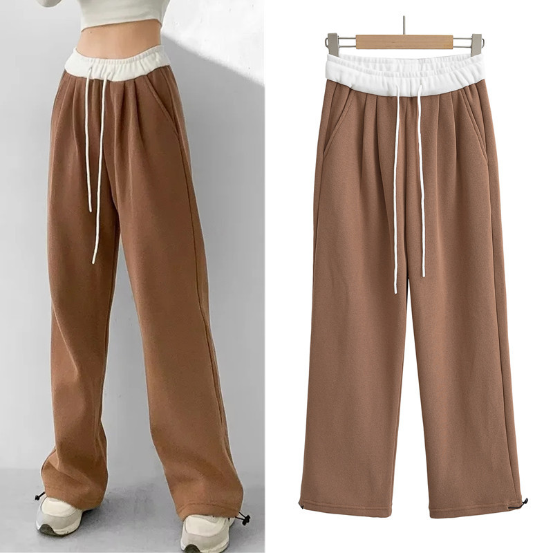 高腰の色合わせとベルベットの厚いモップのズボンのゆったりした広脚のズボンの女性の冬のひもの高腰のストレートのカジュアルなスポーツのズボン