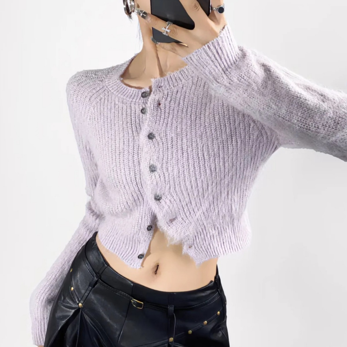甘い辛い風の丸首の単列は馬海毛のニットのカーディガンのコートの女性の2023秋の短い金の毛の長袖のセーターを掛けます。