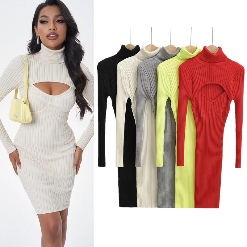 アメリカのINSギャルのセクシーな修身の胸の透かし彫りの高襟のニットのスカートの女性の秋は底を打ってお尻のワンピースを包みます。