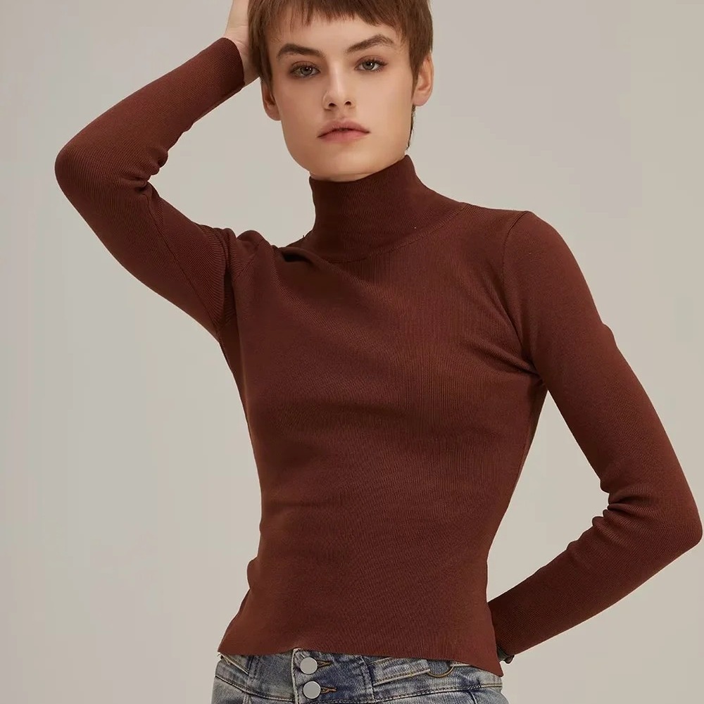 2023秋冬ギャルの基礎モデルの純色の平織りの高襟の底のシャツの女性の中に弾力性の修身するニットの上着を掛けます。