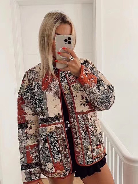 2023新型女装百合プリント立襟ポケット長袖ゆるい綿服コート