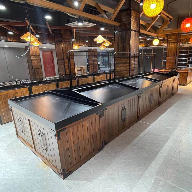 スーパーマーケットの棚の木製の情景の積み上げの間食は鉄の棚の木の箱の組み合わせの情景の積み上げの展示棚を並べます。