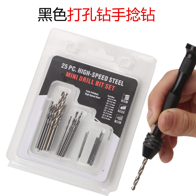 黒い手撚りドリルに麻花ドリルをつけて、手動で穴を開けます。