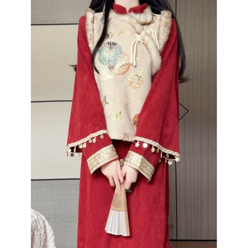 2024秋冬新中国式復古国風改良馬甲旗のガウンのスカートの2つのセットの赤い正月の腰のワンピース