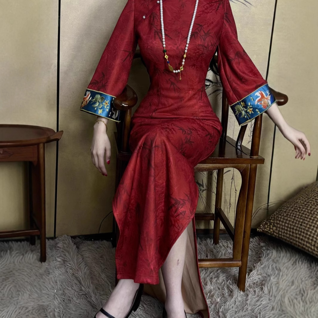 赤い長袖チャイナドレス、新中式2025年新作、婚約式用晨袍改良版、若い女の子の帰省用