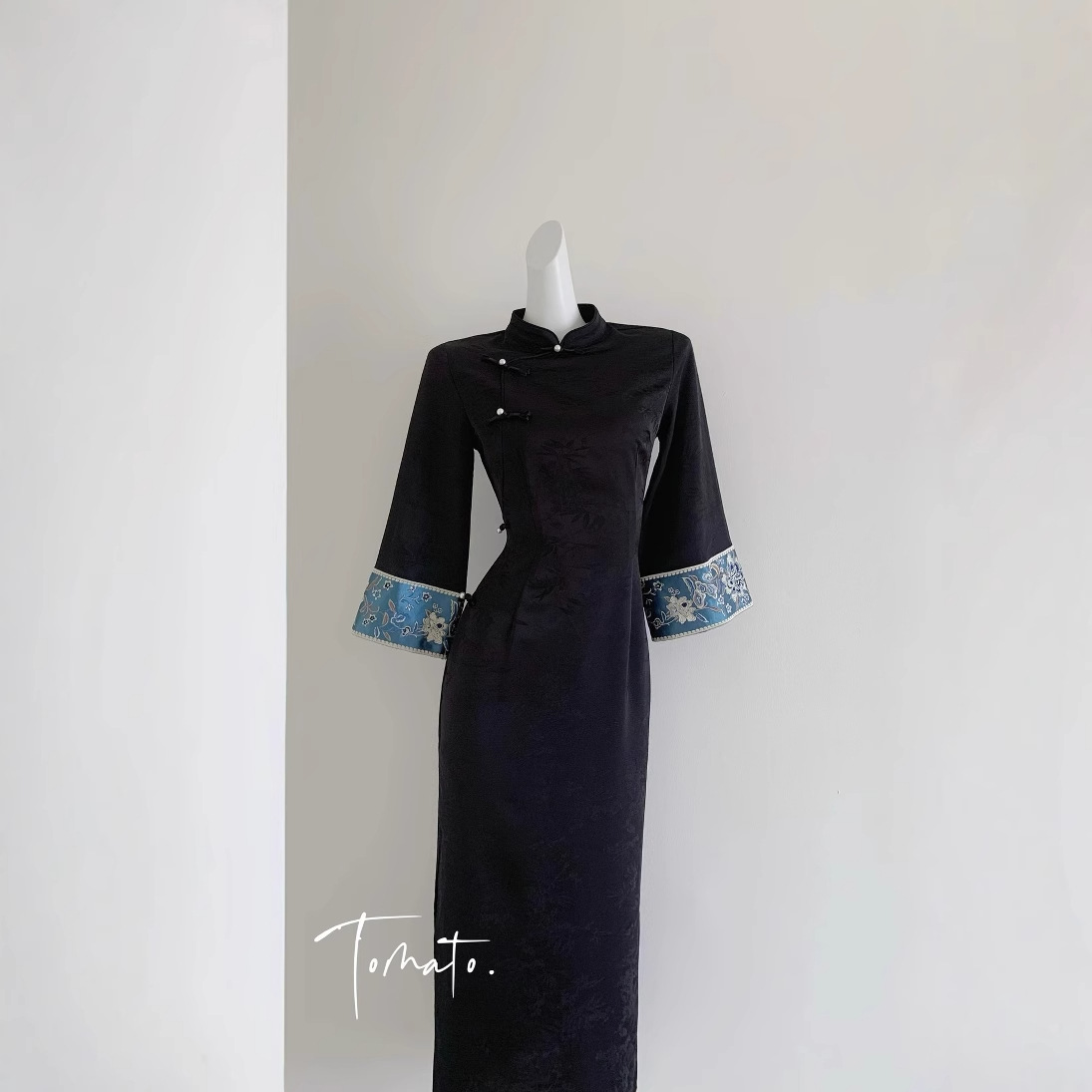 【星黛】新中国式レトロ改良チャイナドレス逆大袖刺繍黒ワンピース若い秋冬