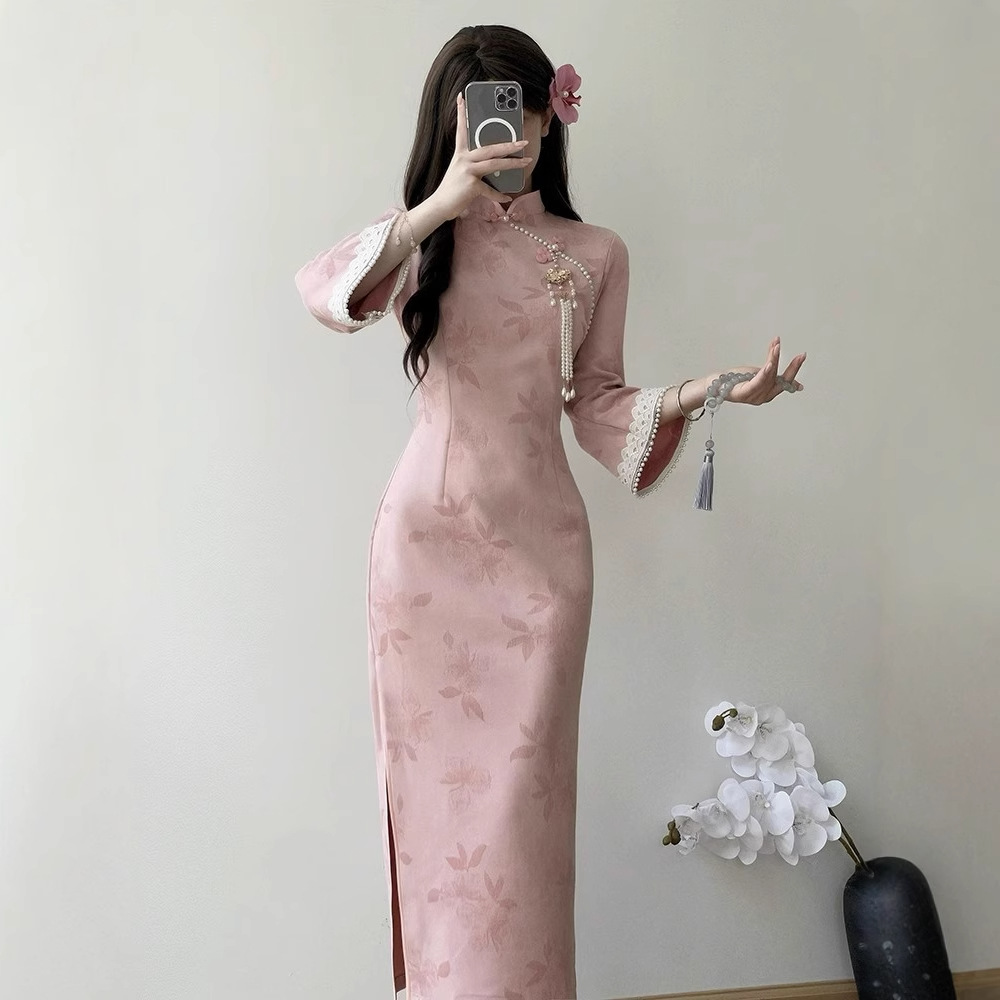 ピンクのスエードレディーススタイル逆大袖チャイナドレス、2025年秋の新作改良版、新しい中国風、若々しいスタイル、日常着に最適