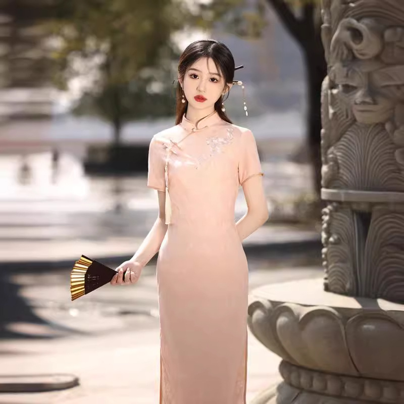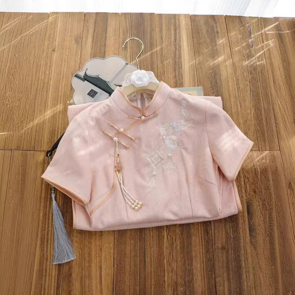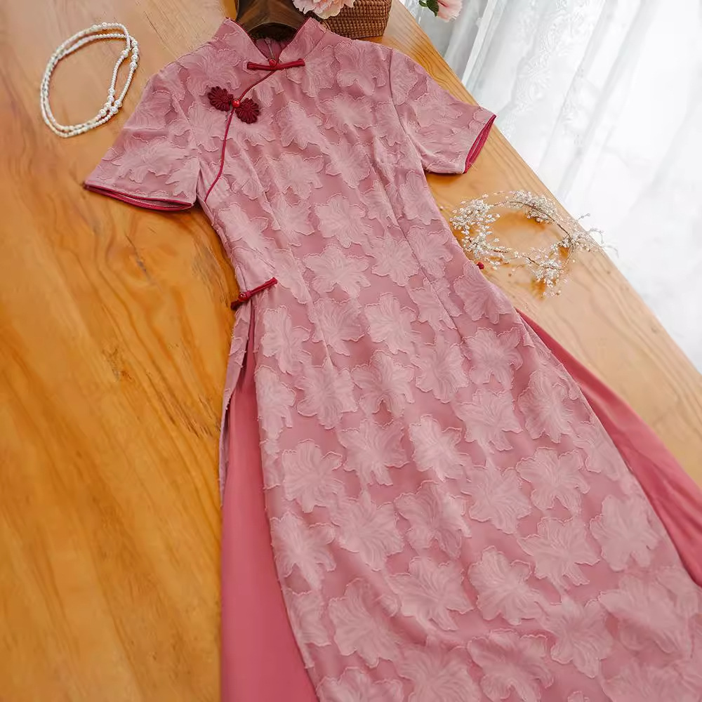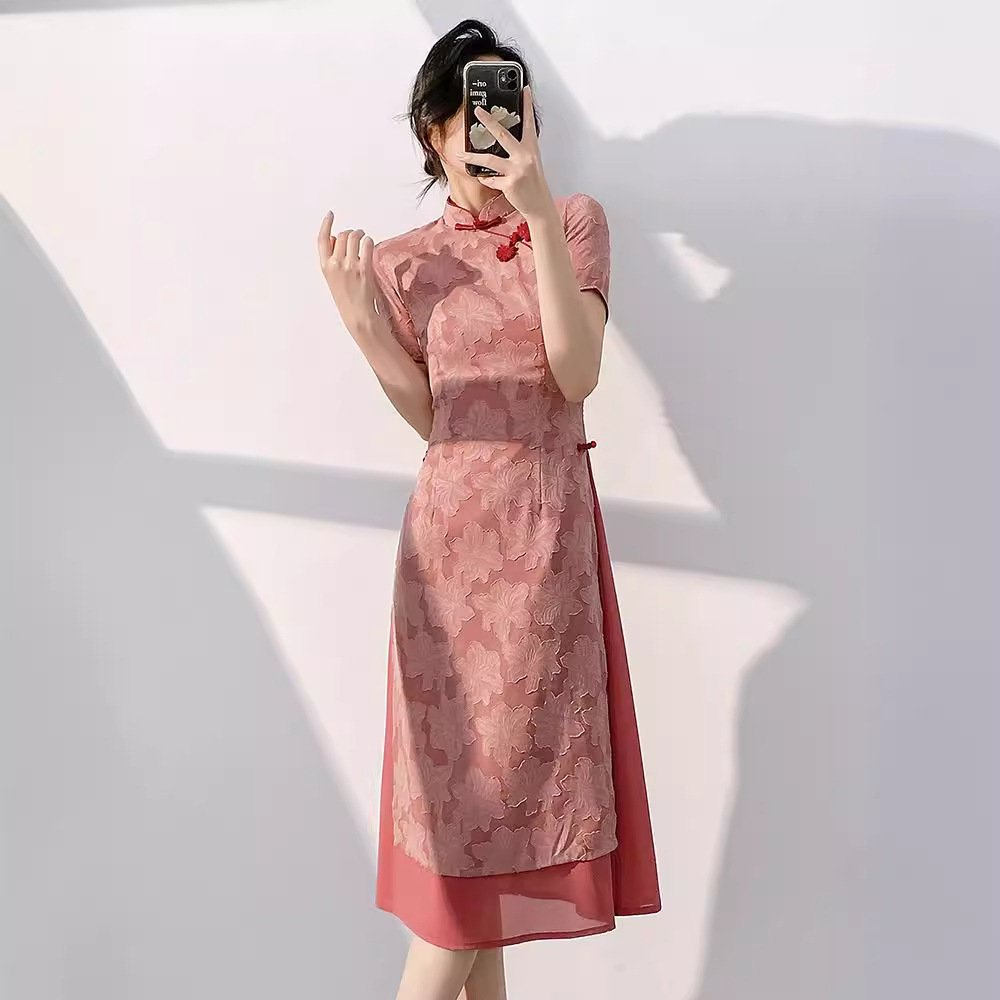 ピンクのチャイナドレス2024新夏新中国式改良若いタイプの少女ワンピース奥黛雪紡織中長