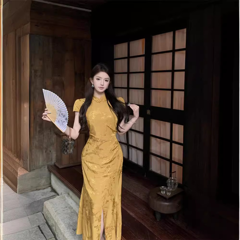 新中国式改良チャイナドレスの半袖ワンピース女性の夏の金色のジャカードが開いています。