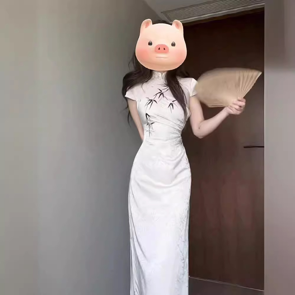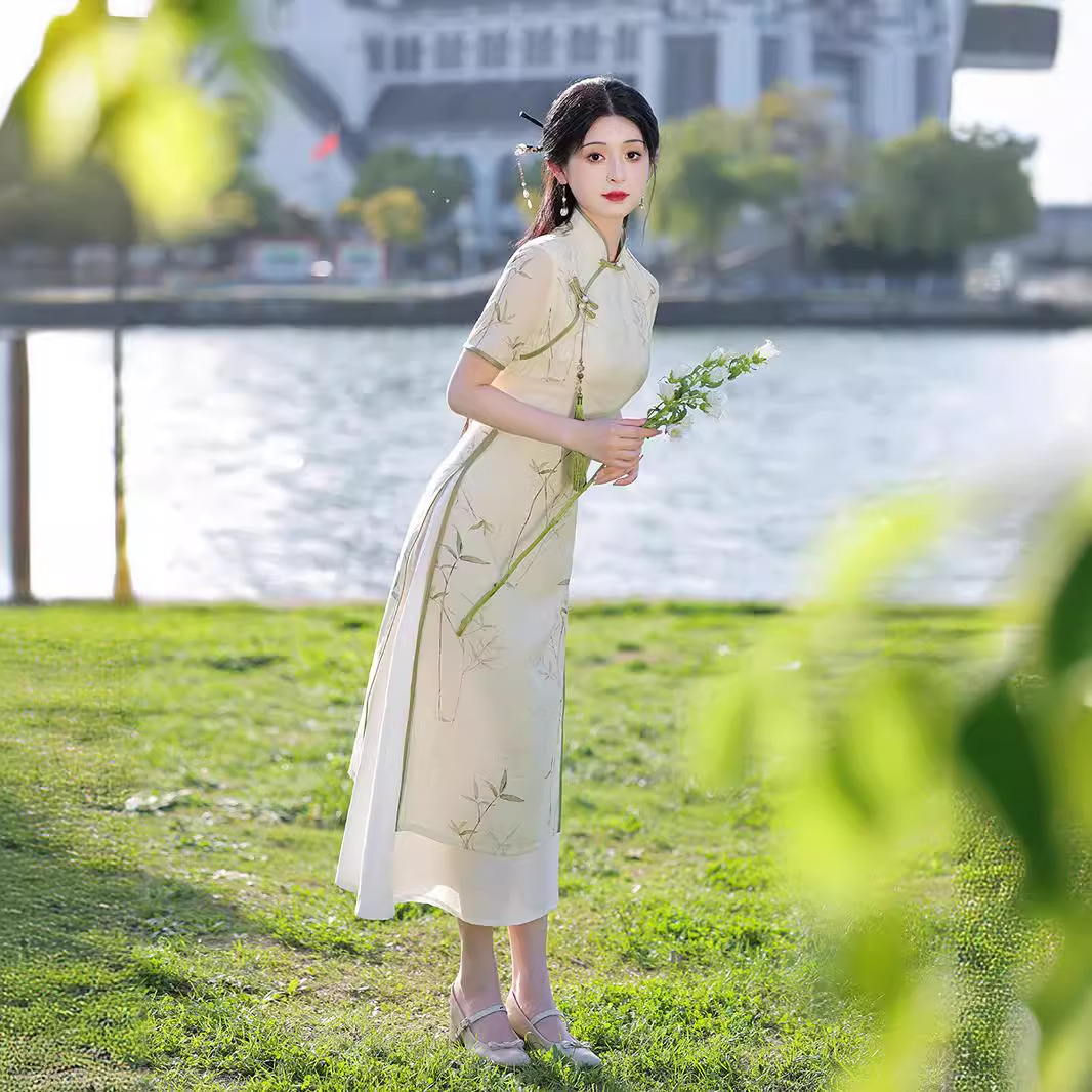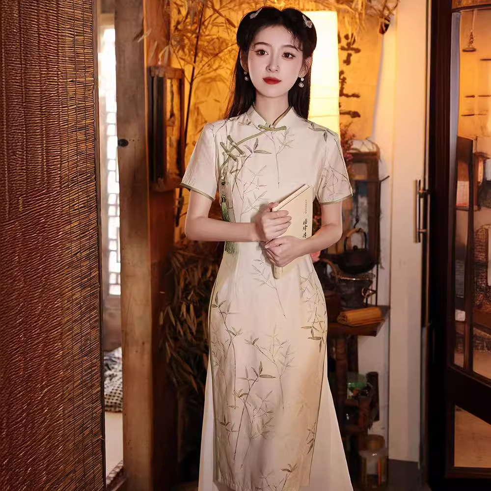 新中国式国風竹刺繍ワンピース女性2024夏改良チャイナドレス痩せレトロオープンロングスカート