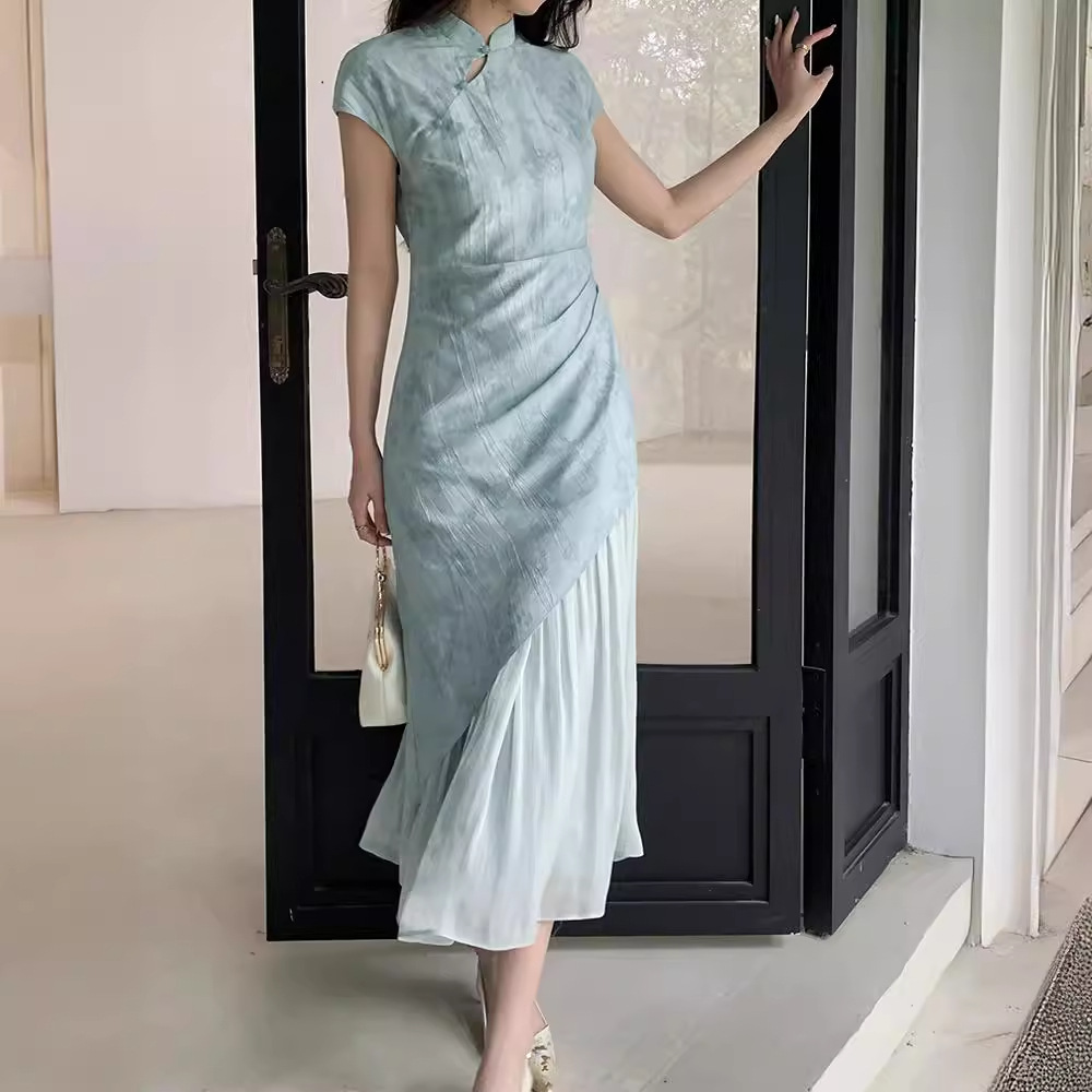 新しい中国風の優しい風のチャイナドレスのワンピースの女性の夏のデザイン感は腰のしわの気質のオープンフォークのドレスのスカートを収めます。