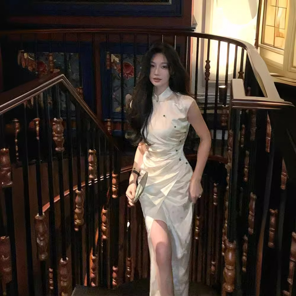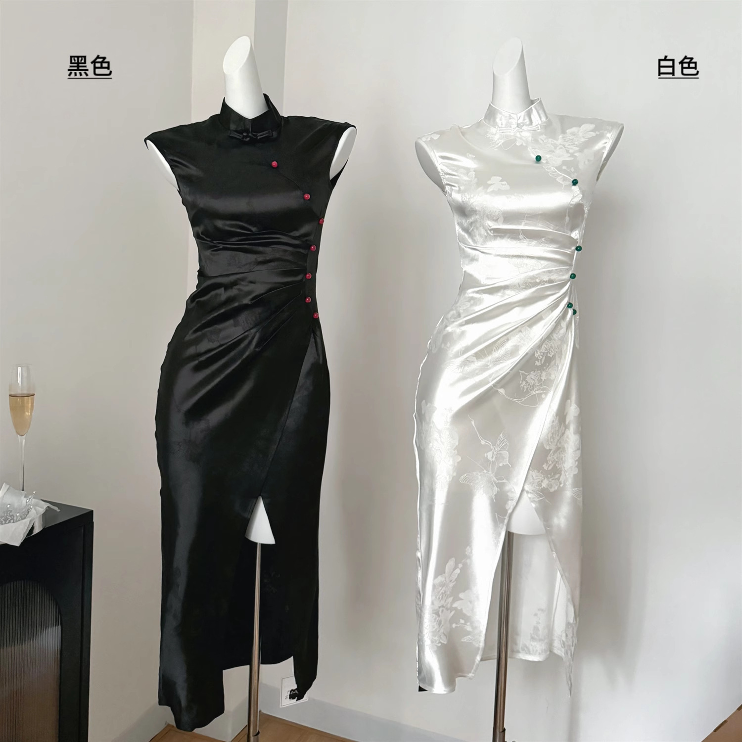 新中国風サテンワンピース高級感ジャカードノースリーブオープンフォークチャイナドレスロングスカート