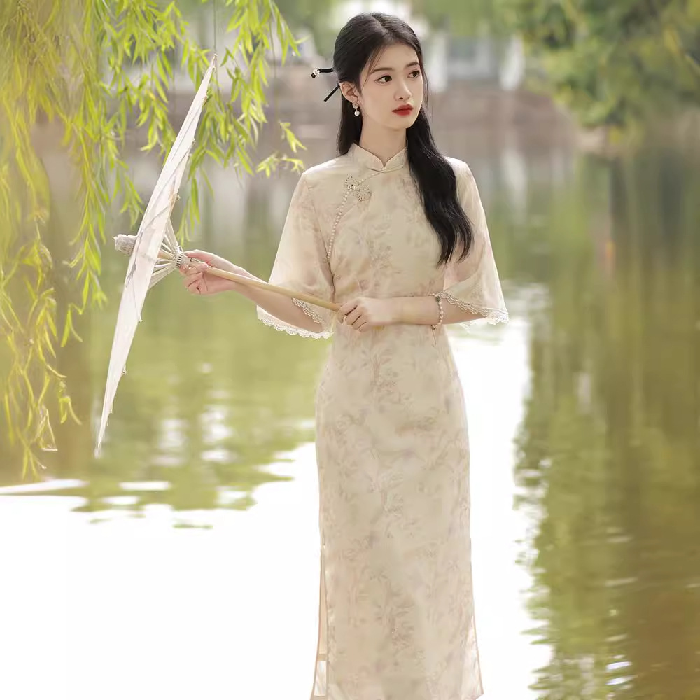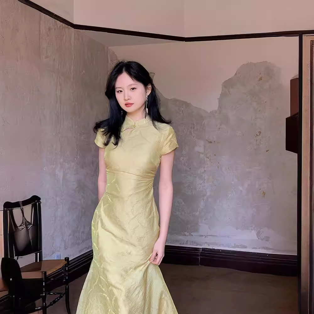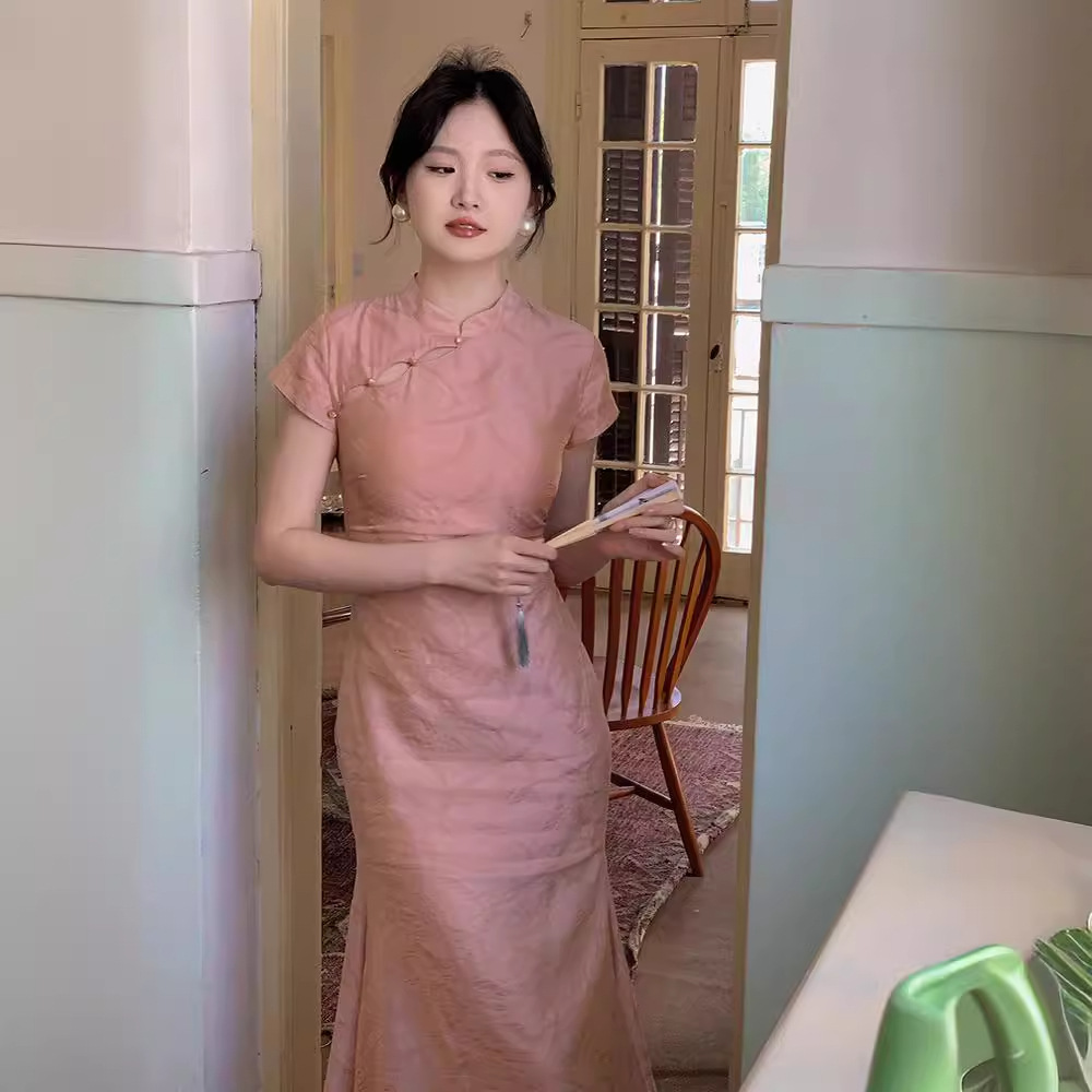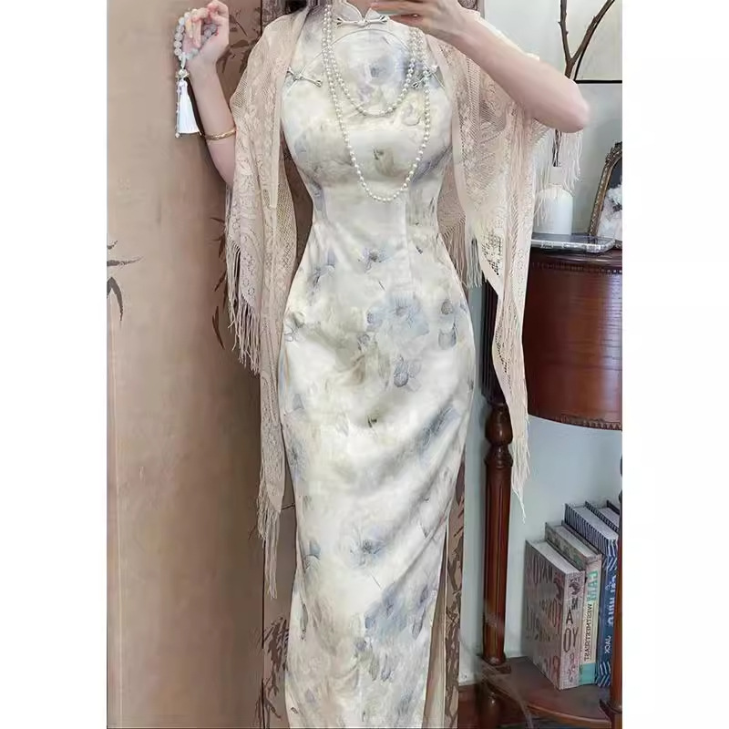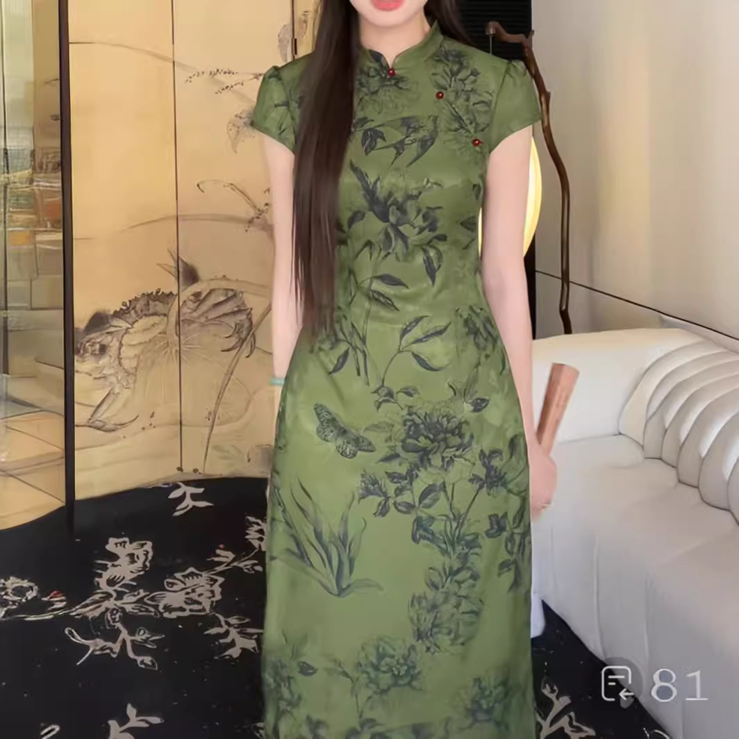新中式改良少女風提花旗袍2025年夏エレガントで優しい花柄ロングワンピース
