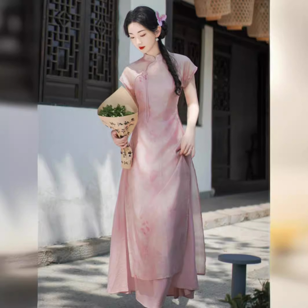 チャイナドレスの女性の新しい中国式の女装は若いタイプの少女の夏のスーツのピンクの高級な甘いワンピースの日常を改良します。