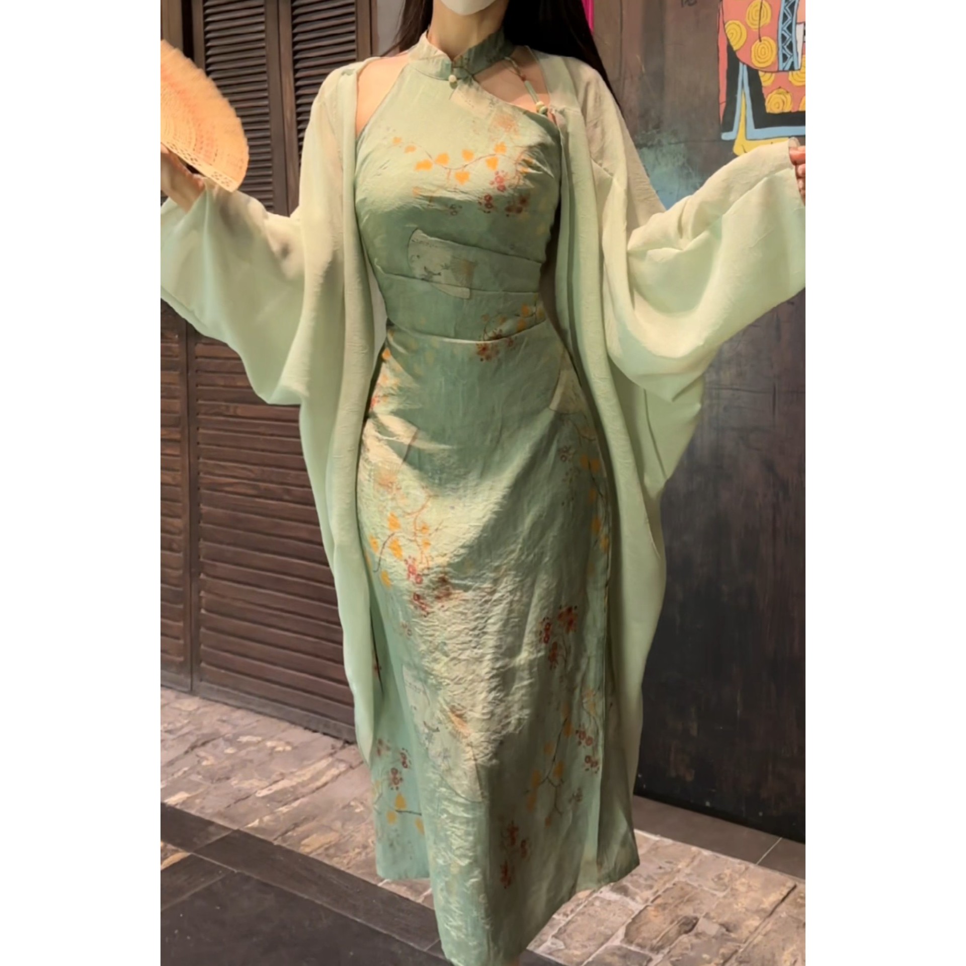 新中国風国風改良版緑のチャイナドレスのワンピース