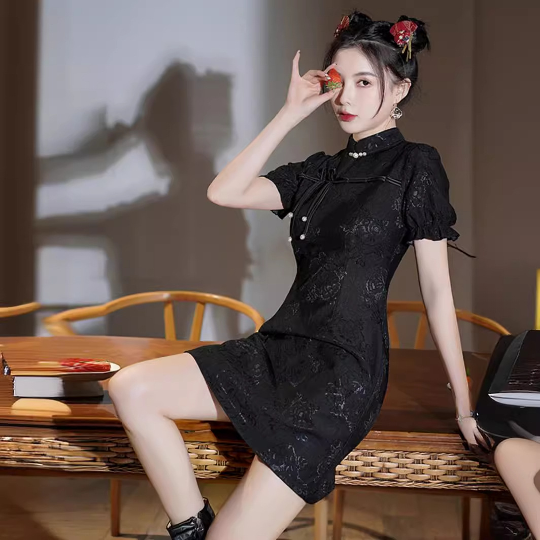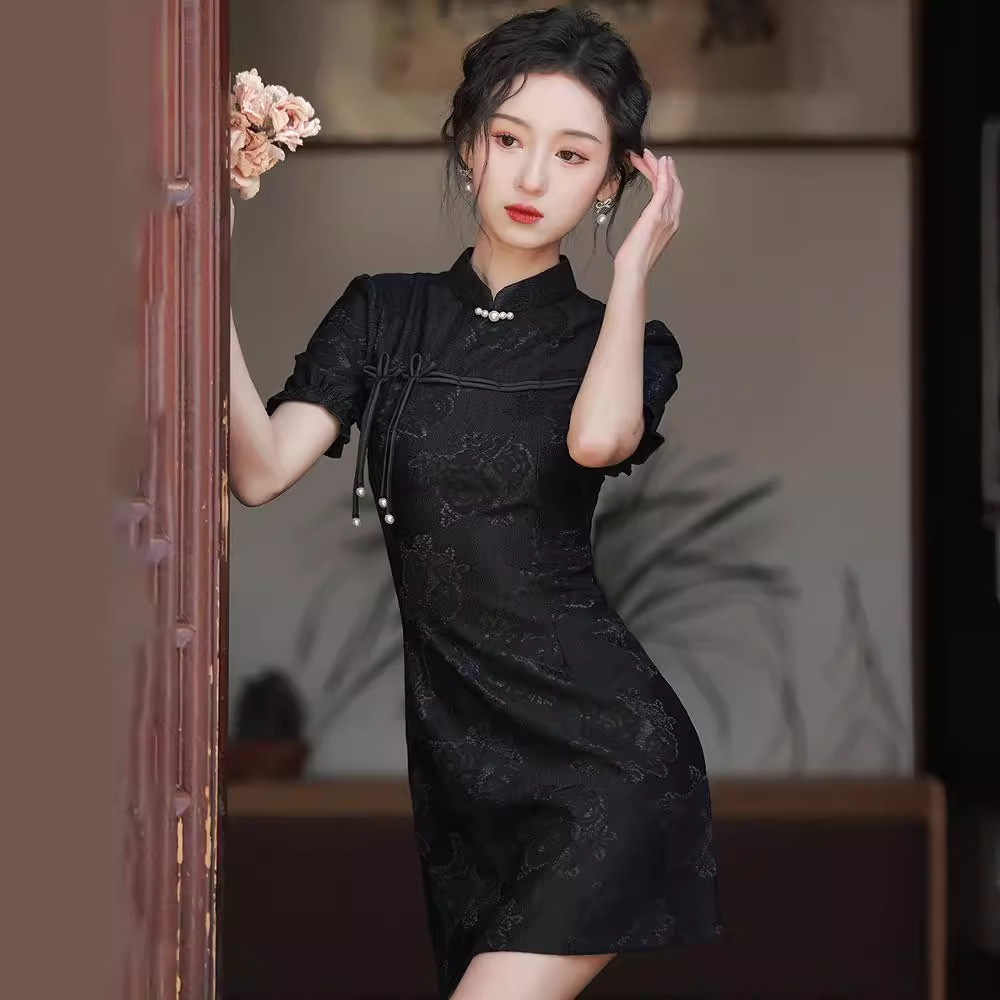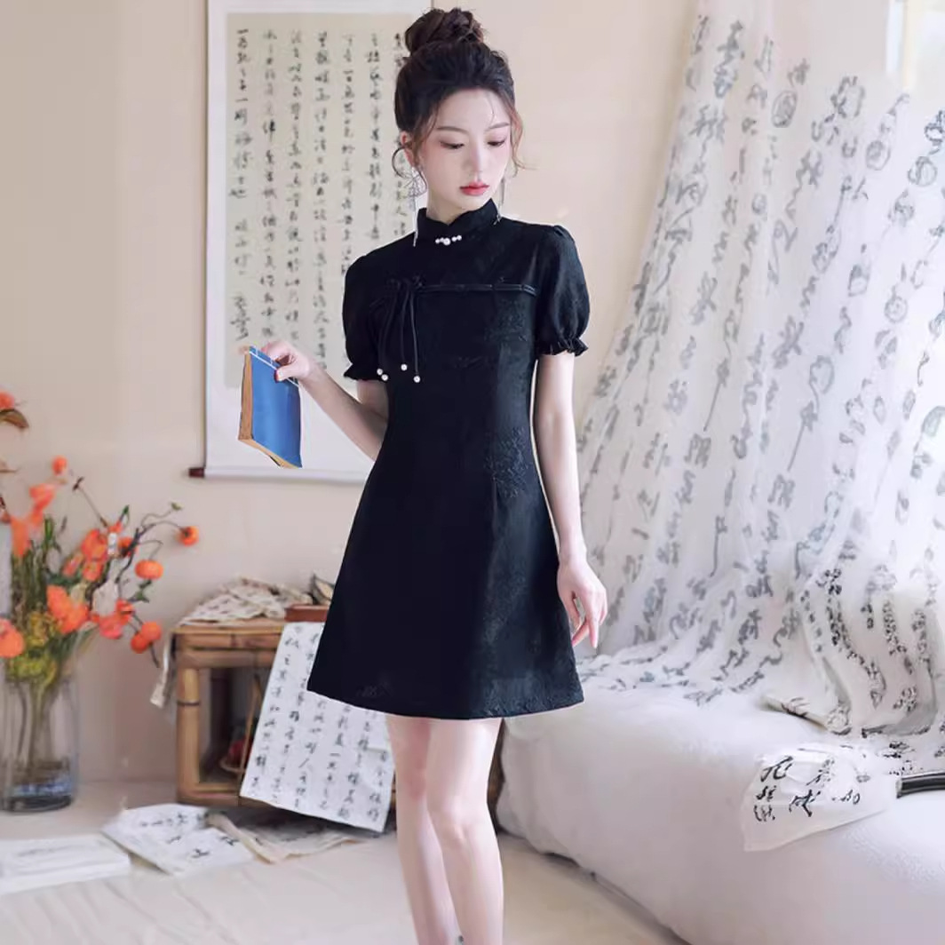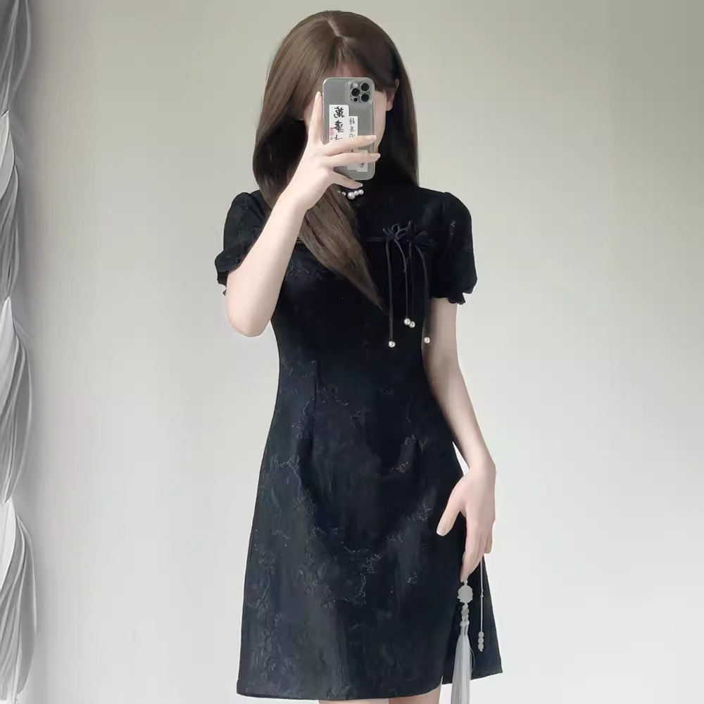 改良されたチャイナドレス夏2025新しいショートスタイル小さなデイリー若い女の子黒国民風ドレス