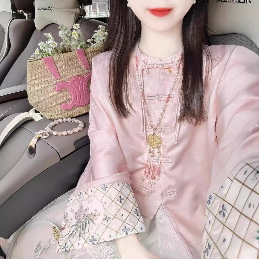 新中式風初秋ジャケット レディース 秋2025新作 ピンク刺繍トップス 白ガーゼスカート ツーピースセット