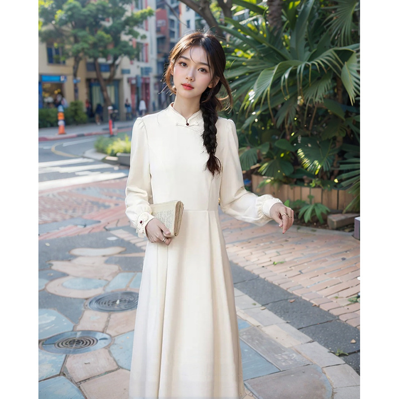 新しい中国式のチャイナドレスのワンピースの女性の春の2024新型の優しくて甘い乳の利口な修身はやせている盤のボタンの中で長いスカートを掛けます。