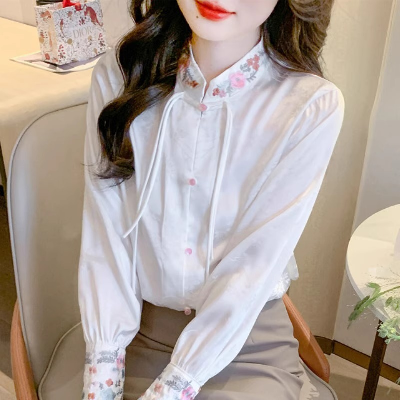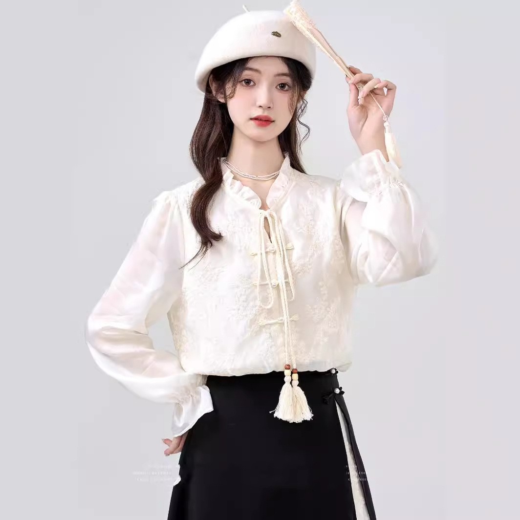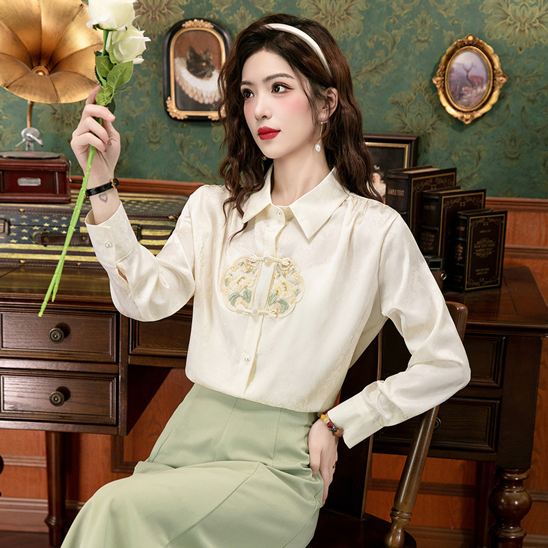 新中国式シフォンシャツ早春秋2024年新作婦人服上着国風刺繍シャツの気質が痩せている