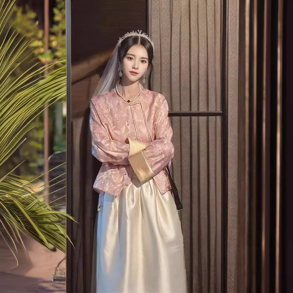 春の新作新中国式女装国風禅意茶服セットピンクのスカート2点セットの女性