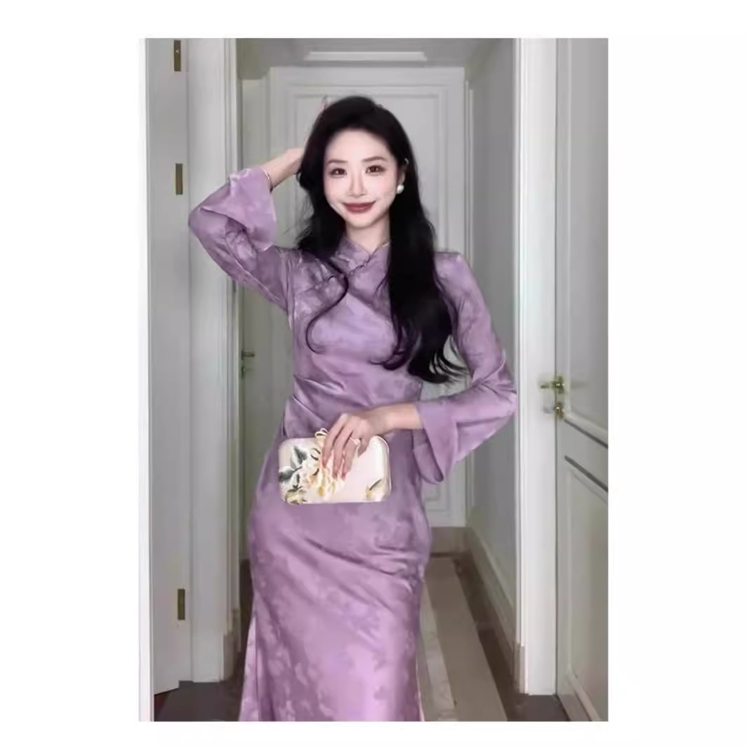 2024秋冬新作ロングスカート新中国風紫チャイナドレス春と秋の長袖スカート