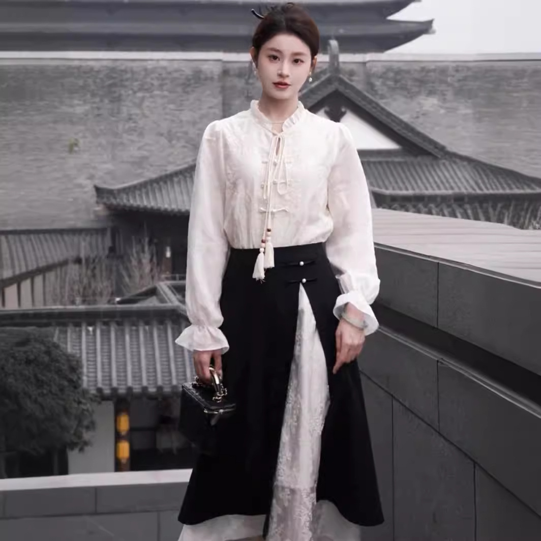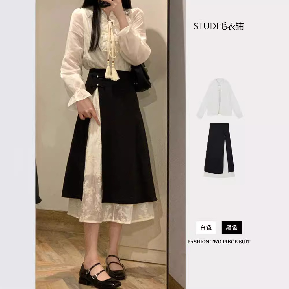 国風高級感レース襟シャツセット女性春新中国式着合わせオープンスカート2点セット
