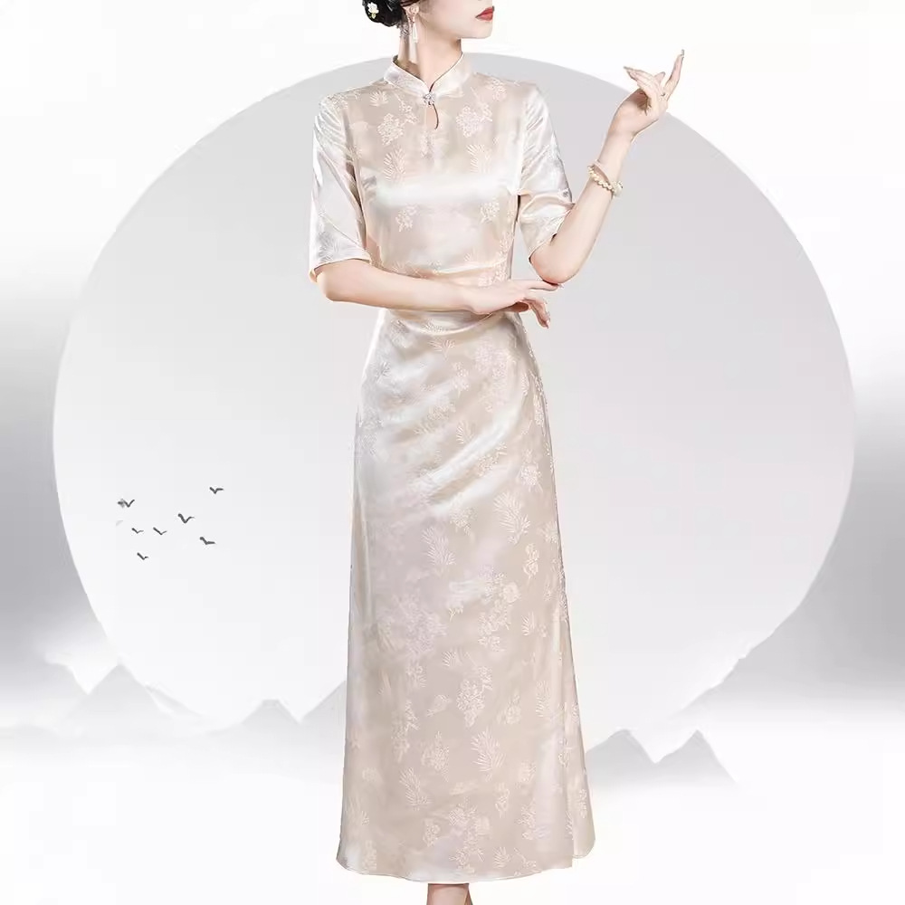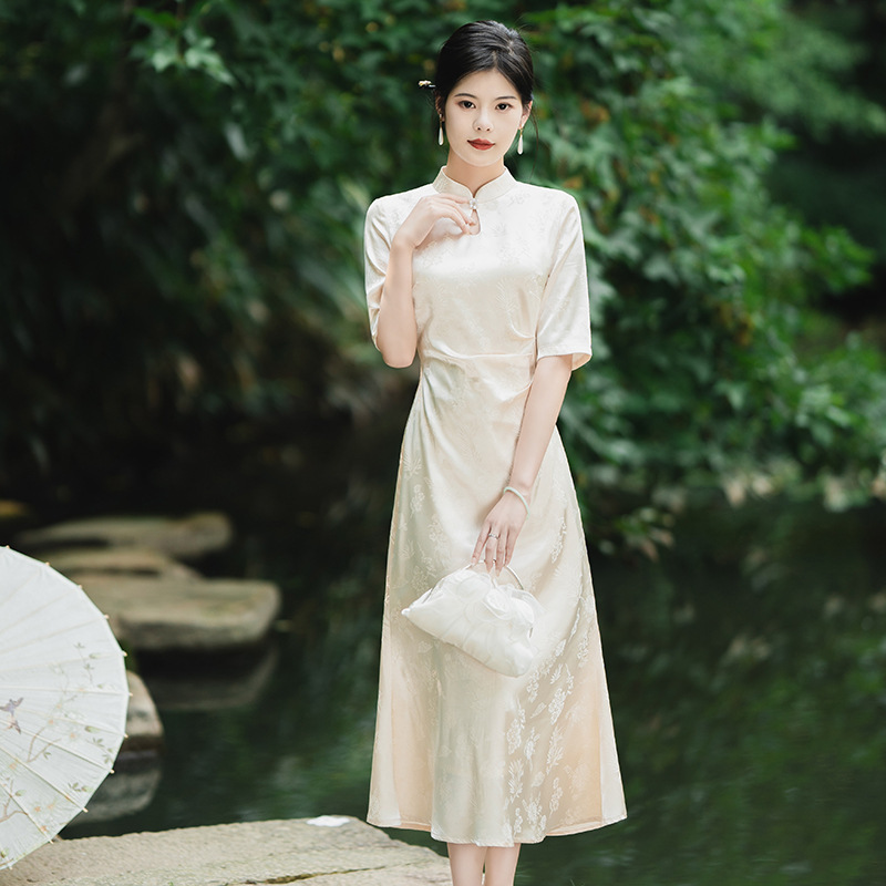 シャンパン色の国風はチャイナドレスの女性の高級気質の新しい中国式の高貴なワンピースの春夏の小さい子の2024を改良します。