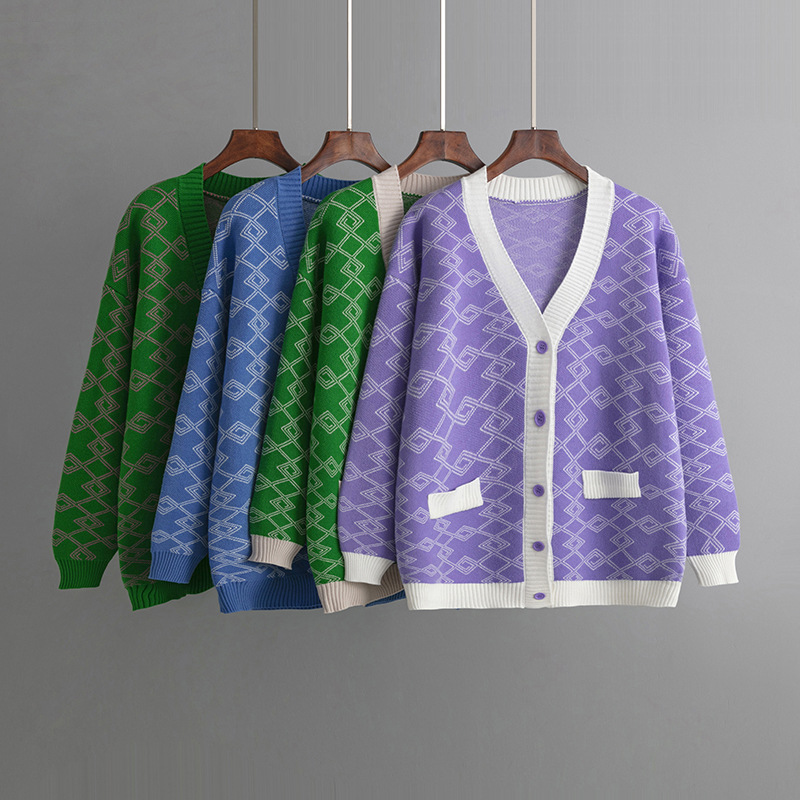 クロスボーダーの大きいサイズの婦人服2022秋冬ジャカードの衝突色のゆったりしたセーターの長いカーディガンのコート