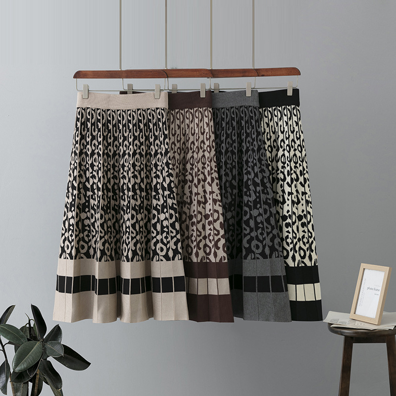 2023年秋冬新款复古豹纹撞色针织半身裙女A字百褶裙大摆中长款