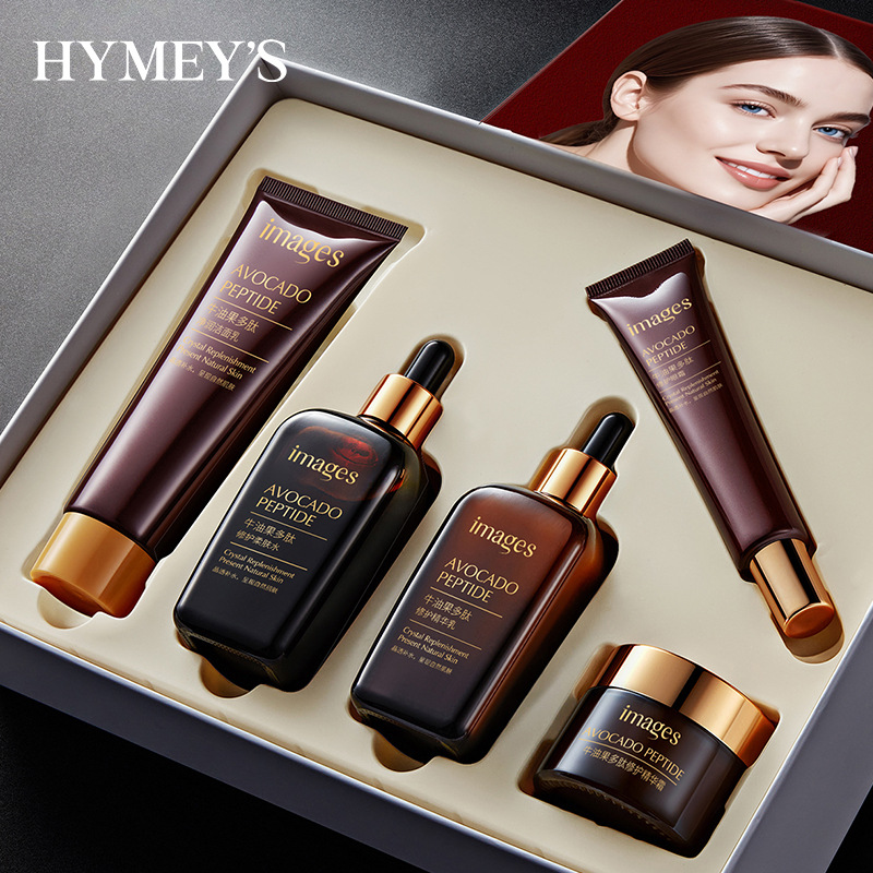 イメージの美しい牛油果のポリペプチドスキンケアのセットの箱は水を補って保湿して肌の色の小さいブラウンの瓶のスキンケアのセットを明るくします。