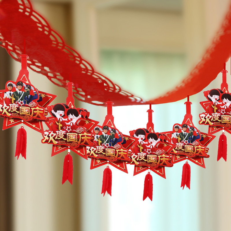 国慶節の旗の装飾品のデパートの店の学校は門を祝って祭りの雰囲気のシーンに対して道具の卸売りを配置します。