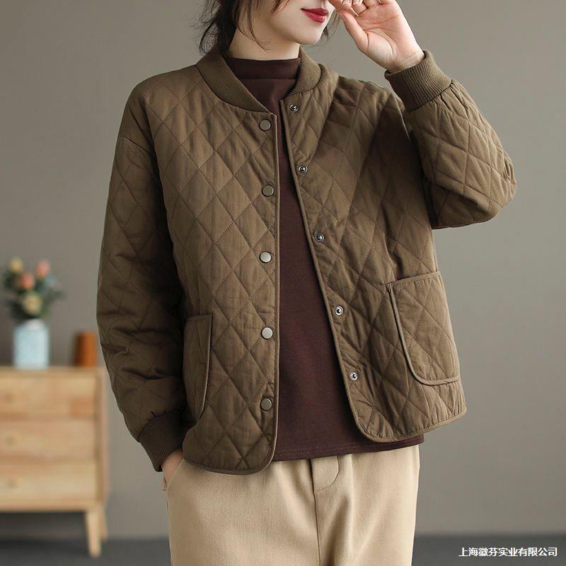 菱形中綿ジャケット、軽量中綿ジャケット、無地ショートスタイル、秋冬新作ママ服
