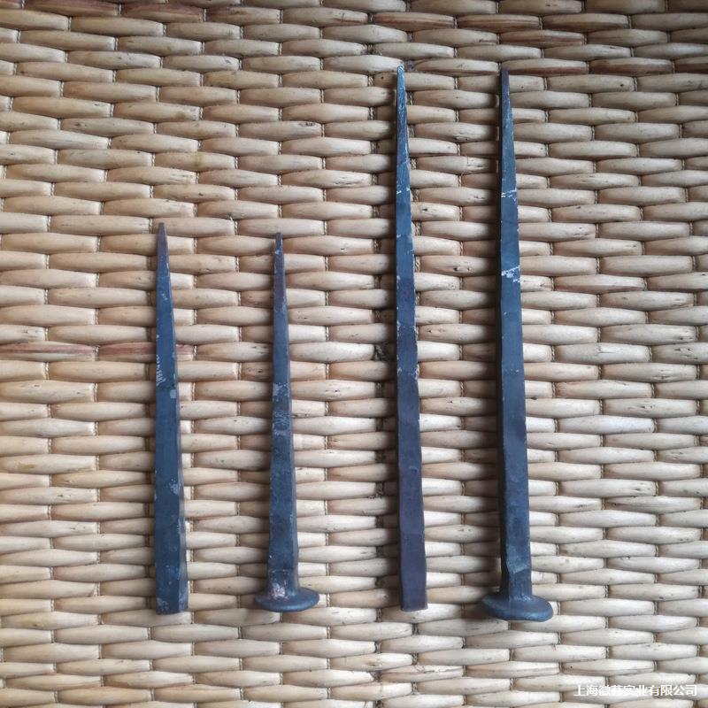龍船大頭の古い寿材の鍛冶屋の棺釘角鉄を打ち直し、再び釘付けします。