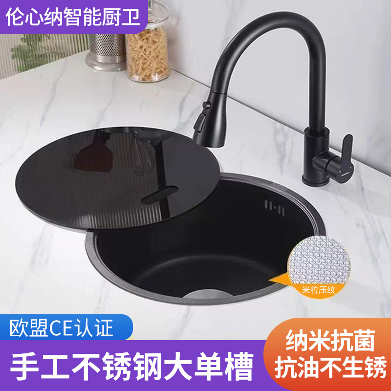 隠しバーシンク台所ステルス手作りシングル槽蓋付き中島トランペット水たまりステンレスナノ黒シングル槽