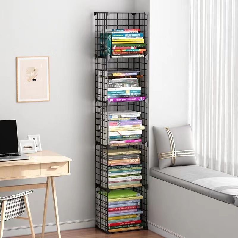 舞い上がる窓の簡易な本棚の縦型の着地する学生の机のそばの創意の鉄芸の本は本棚の狭い縫い目の棚を収納します。