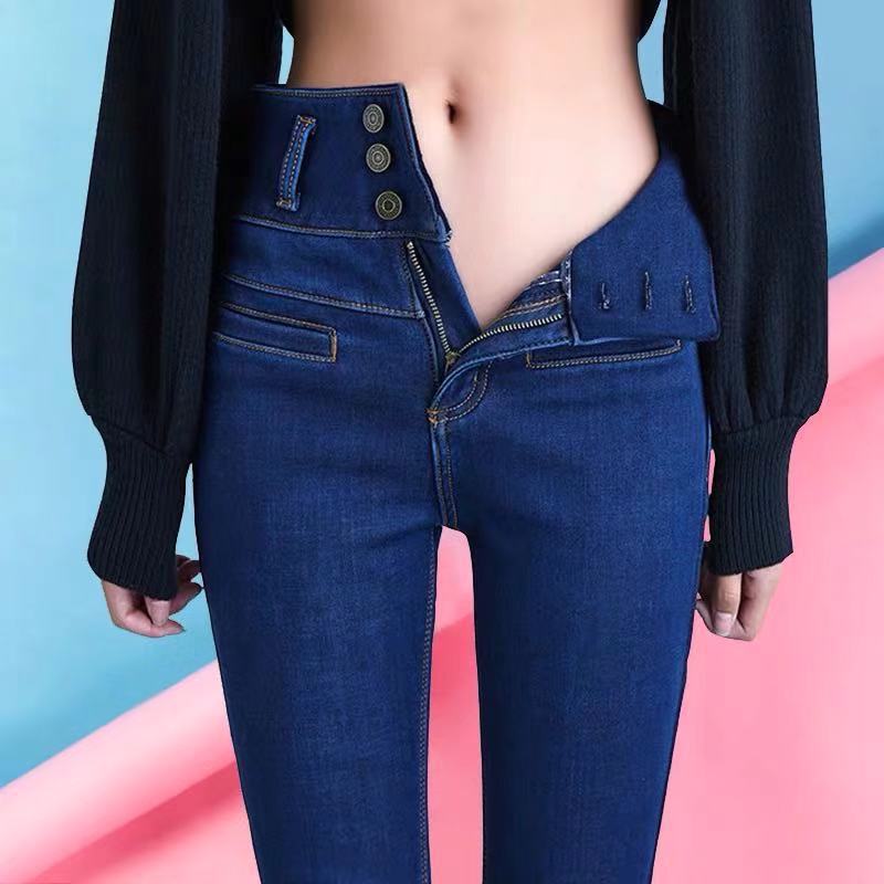 ベルベットの厚いジーンズの女性秋の冬の高腰2022韓国版の新型は痩せていて、足の鉛筆のズボンに合わせている