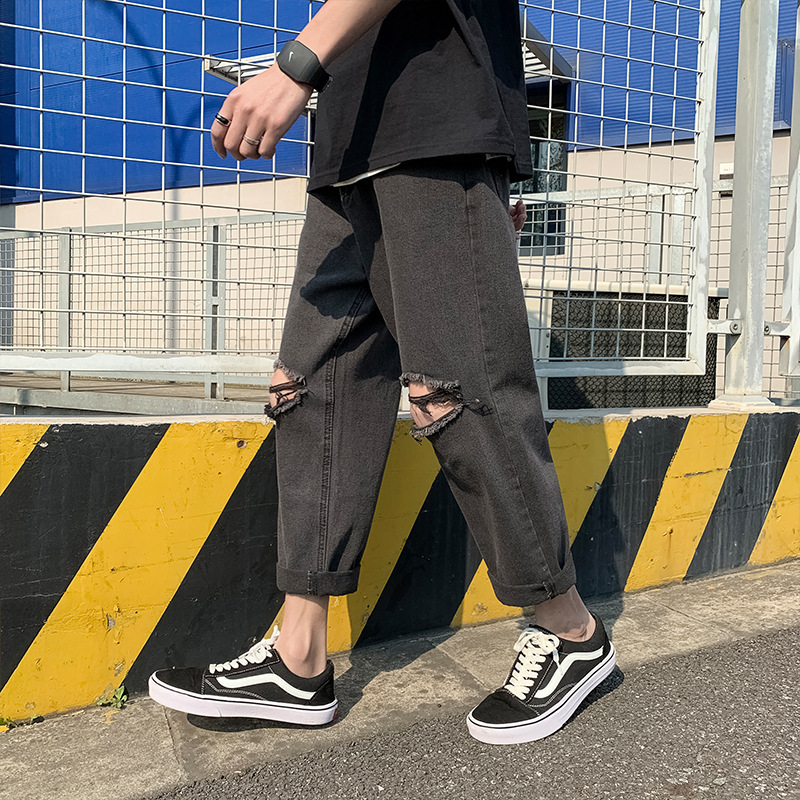潮牌ジーパン男春夏九分膝破洞原宿風日系ヒップホップ香港風ゆるいbfワイドパンツ