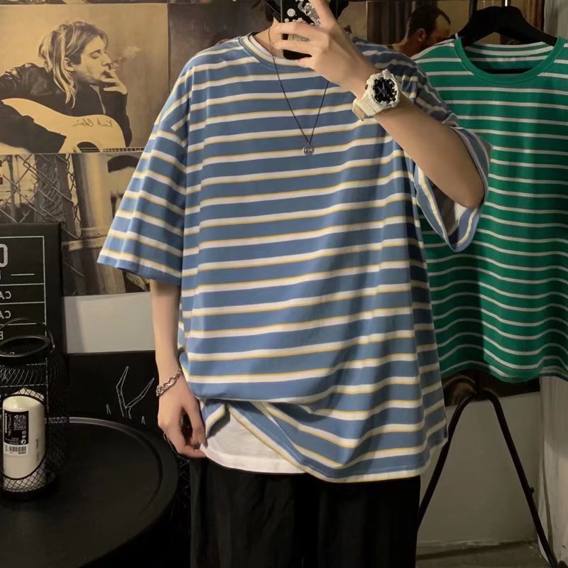 香港風縞tシャツ男性半袖ins潮牌五分半袖大サイズゆるいカップル半袖上着トレンド