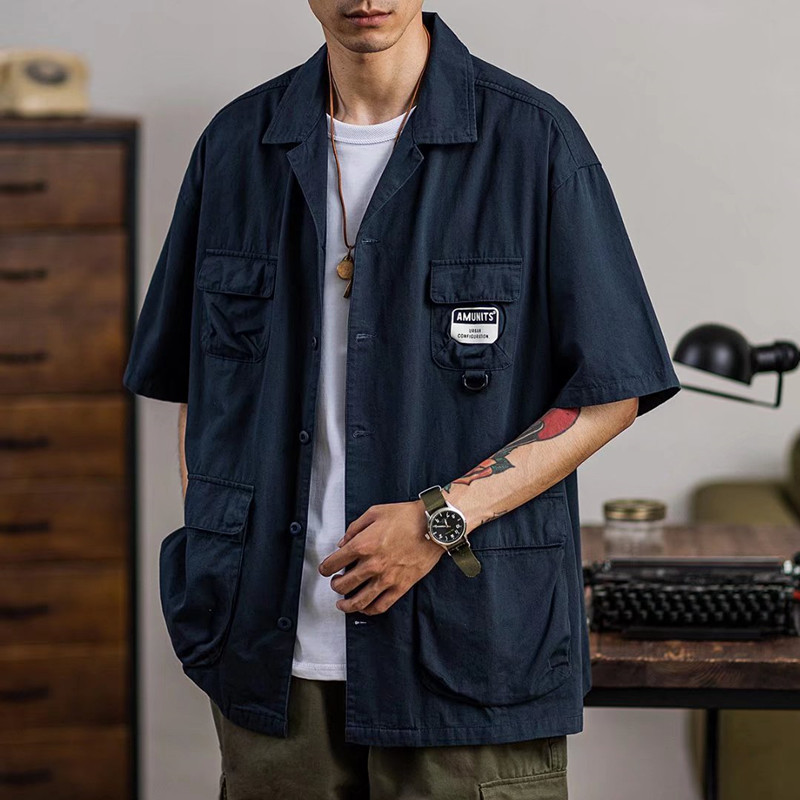 アメリカのレトロな半袖のシャツの男性の夏の機能の風の立体的な多ポケットの日本のシャツのコートの上で服の紳士服