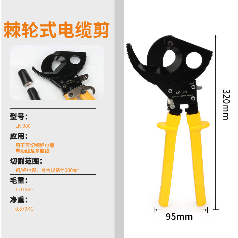 徳瑞工具LK-380ラチェット式ケーブルカッター電力用ハンドル伸縮式歯車はさみ