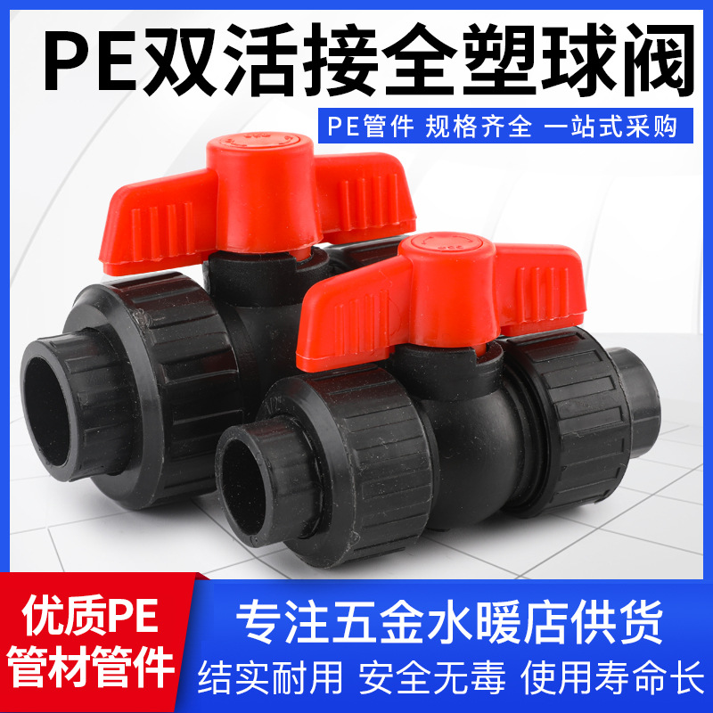 Peパイプの新しい材料のダブルヘッドはバルブのプラスチックコアの赤い柄の平口はボールバルブのpeのダブルを接続して全プラスチックのボールバルブを接続します。