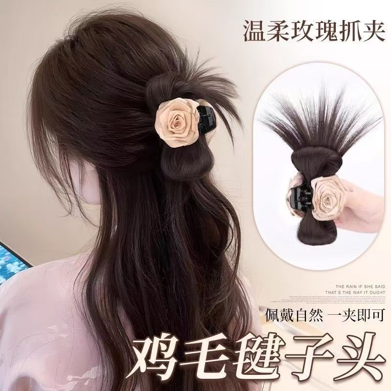 半結び鶏毛羽根頭、新しい中国風鶏の巣ミートボールウィッグ、乾燥したバラの花のクリップ、後頭部の髪