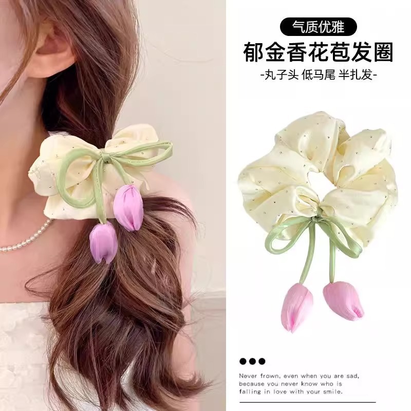 甘いチューリップのつぼみヘアゴム、ポニーテール、万能ヘアゴム、ゴムバンド、インリボンヘッドバンド