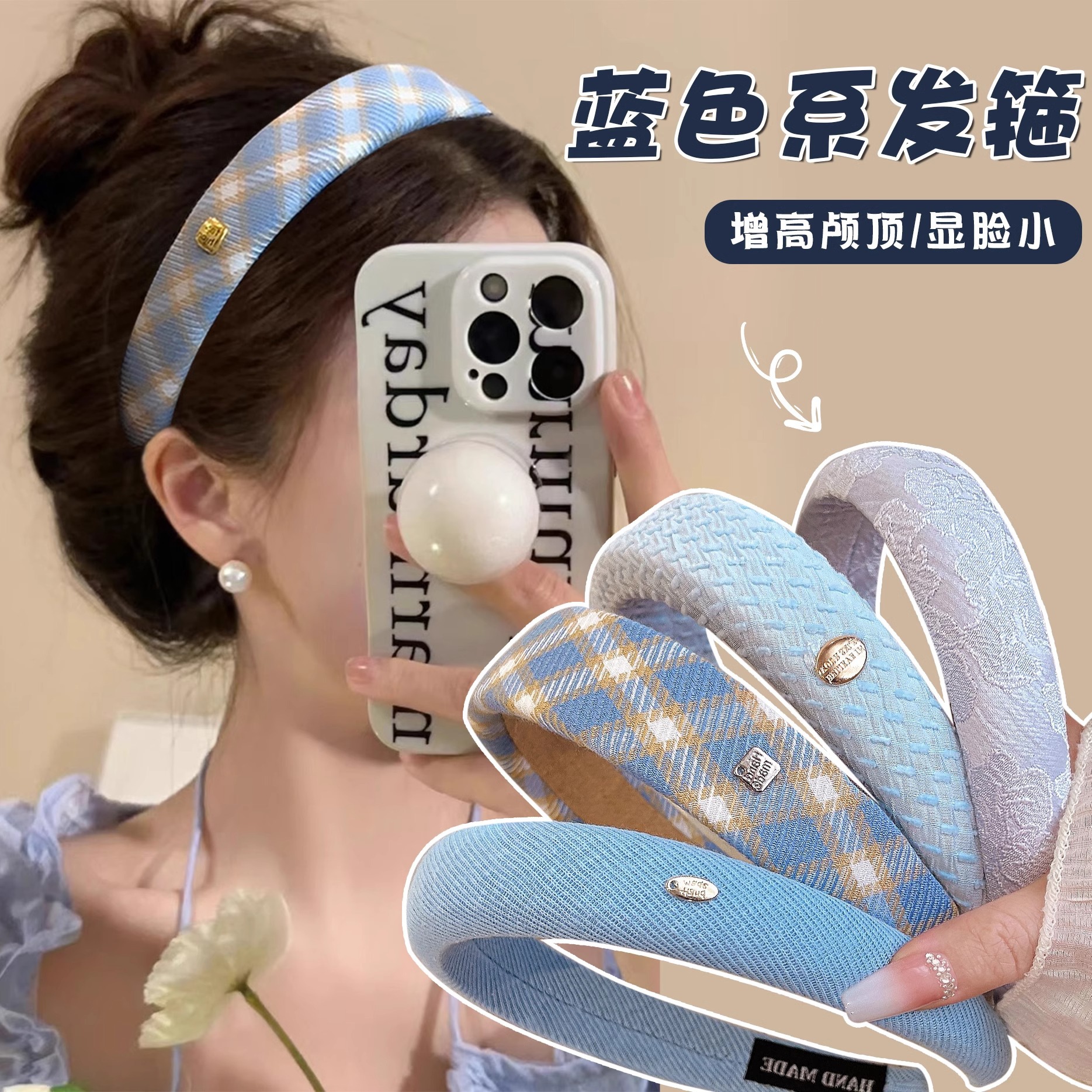 青い高頭トップのカチューシャ女性2024高級韓国の小香風圧髪のカチューシャが外出しています。