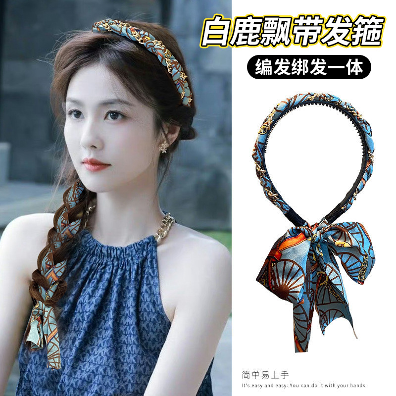 白鹿の同タイプのリボンのカチューシャの女性2024の新型の高級感のある髪のスカーフは髪を縛って外出します。